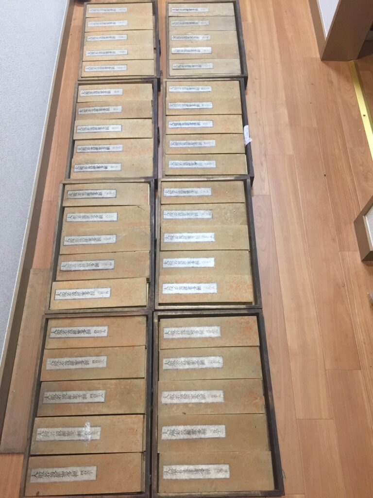 重厚な木箱に整然と収められた姿は圧巻。経典の表紙、題箋(タイトルラベル)も鮮明に残っており、欠落の少ない貴重なコレクションです。