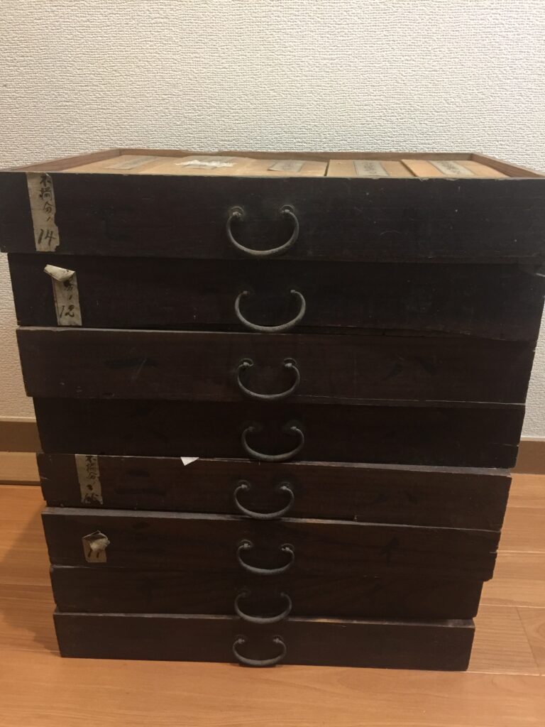 重厚な木箱に整然と収められた姿は圧巻。経典の表紙、題箋(タイトルラベル)も鮮明に残っており、欠落の少ない貴重なコレクションです。